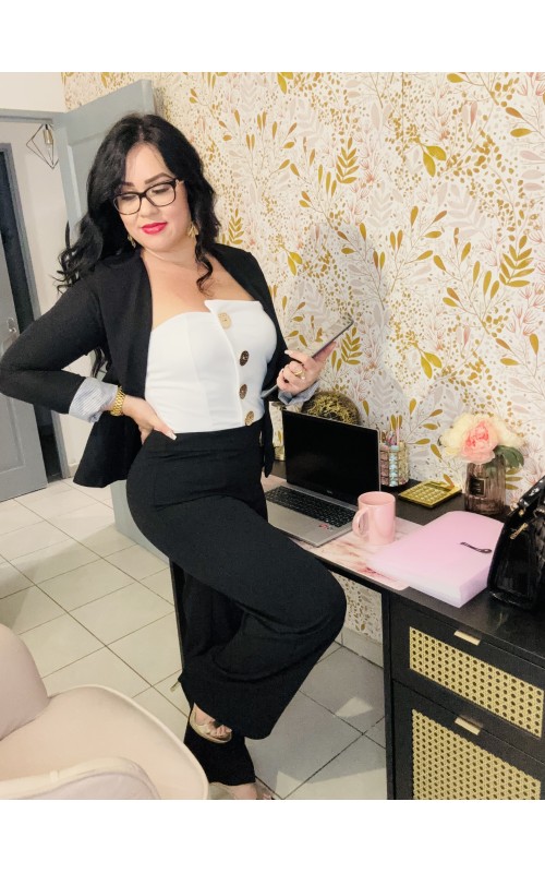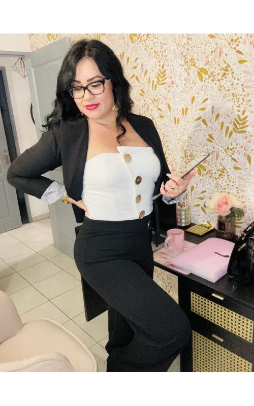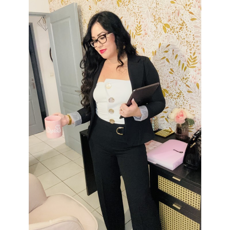 Pantalon taille haute détail boucle dorée, fermeture invisible sur le côté, matière élasthane
