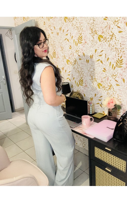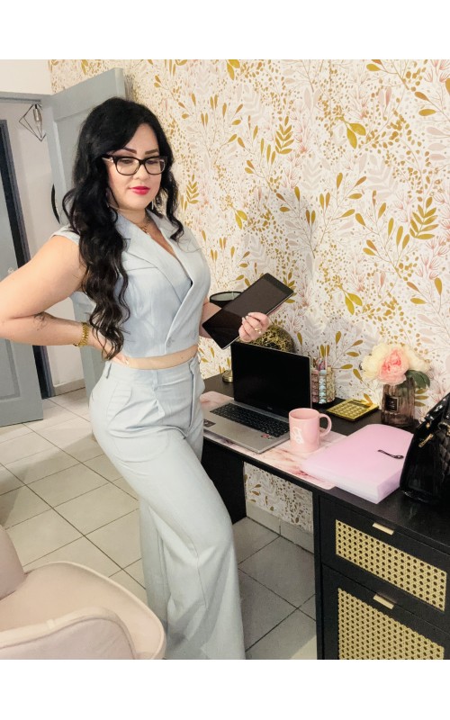 Ensemble tailleur veste & pantalon, veste court avec bouton intérieur et extérieur, et pantalon large avec bouton invisible