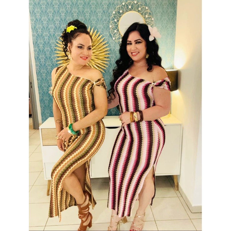 Robe asymétrique à rayures, détail bijou doré au niveau de l'épaule, fendue sur le côté gauche, doublure couleur chair intégrée, matière extensible