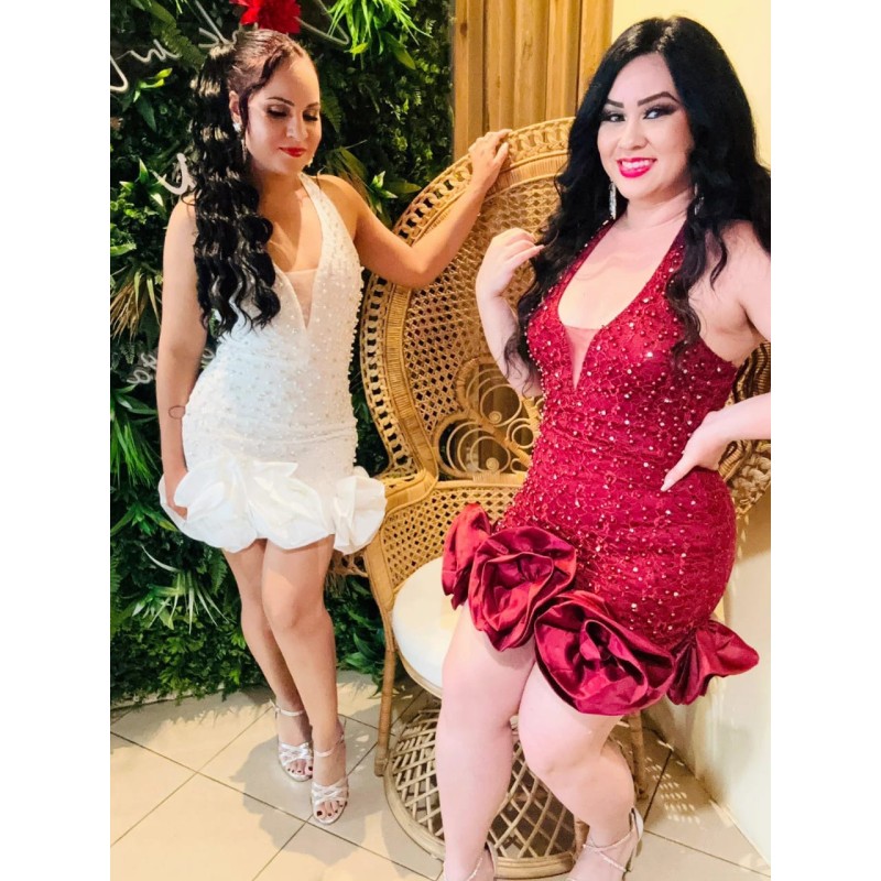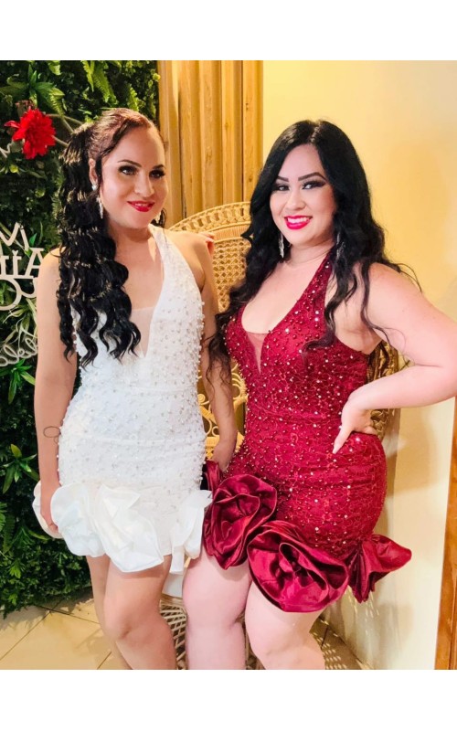 Robe dos nu entièrement brodée, détail fleurs, perles et strass, fermeture à l'arrière, légèrement extensible