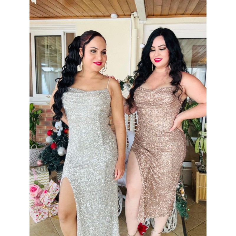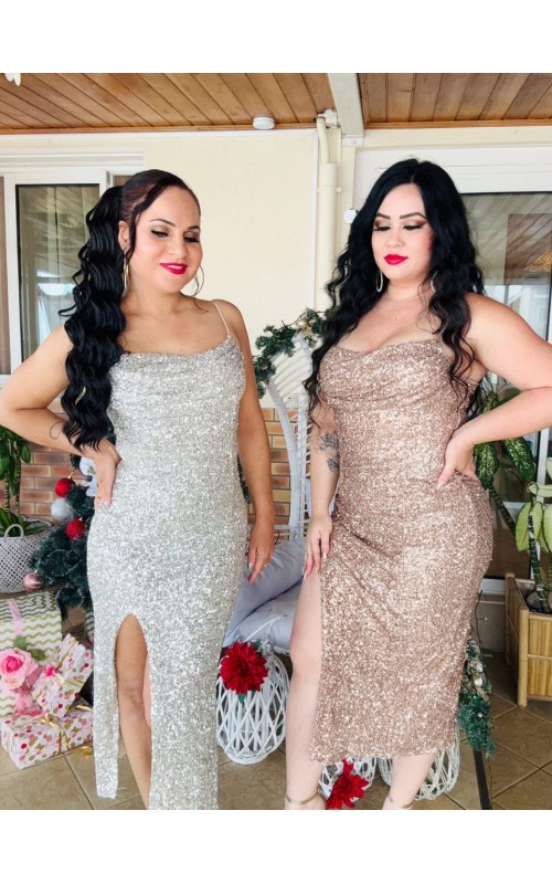 Robe sequin fendue mi-longue, détail drappé sur le décolleté, fendue sur la jambe gauche, bretelles réglables