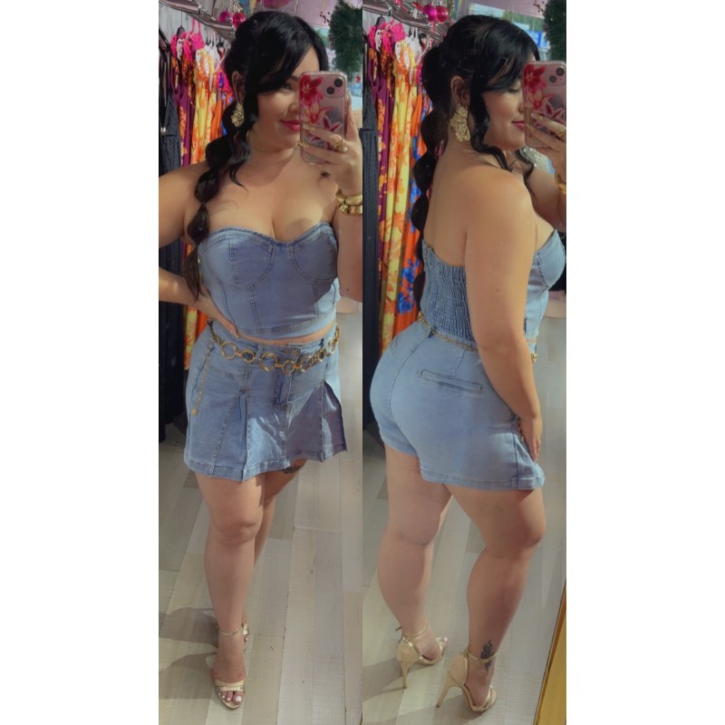 Ensemble jupe/ short jeans, top bustier avec fermeture et élastique à l'arrière, matière extensible