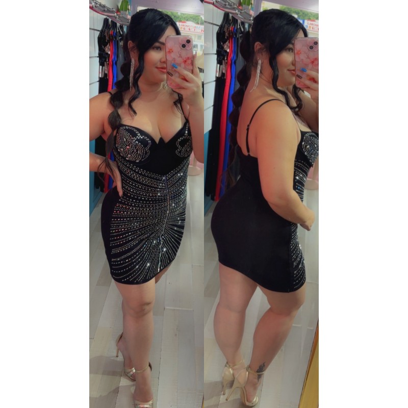 Robe décolletée courte strass, matière extensible, strass sur tout l'avant, bretelles ajustables, coques intégrées avec décolleté plongeant