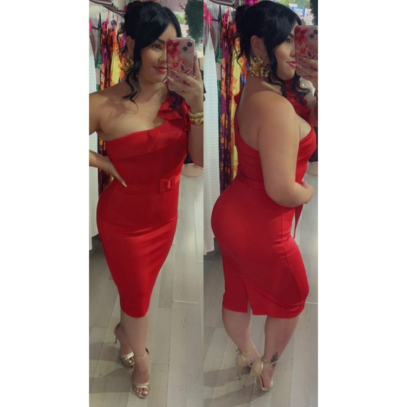 Robe col asymétrique avec volant et ceinture intégrée, fermeture et fente à l'arrière, matière légèrement extensible et gainante